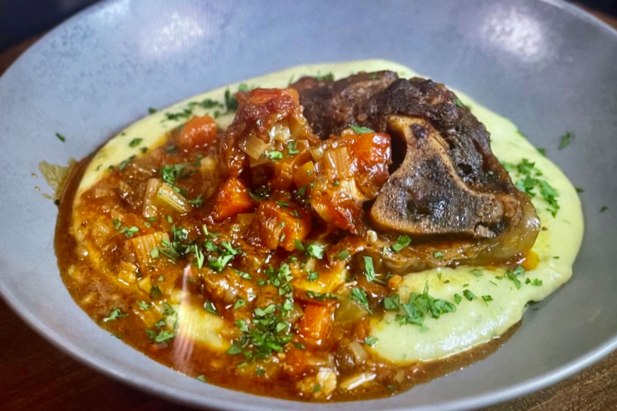 6. Serve up in bowls with the osso bucco over the polenta – sprinkle liberal quantities of parsley over to finish.
